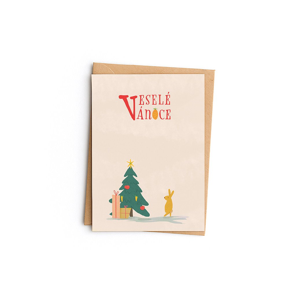 Vánoční pohled s obálkou - králíček a vánoční stromek